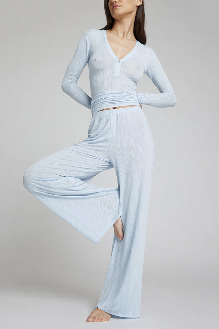 This light blue set is my go-to when I want to feel polished yet effortless. Perfect for lounging around on weekend mornings or sipping coffee on your patio. The cotton is breathable but structured enough to feel put-together.